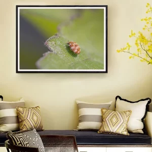 The composition draws the viewer in. The muted palette of cream and green allows the beetle’s presence to take centre stage. There is no rush here. Just balance — a moment held between motion and stillness. The background melts into a soft blur, isolating the subject like a breath suspended in the air.